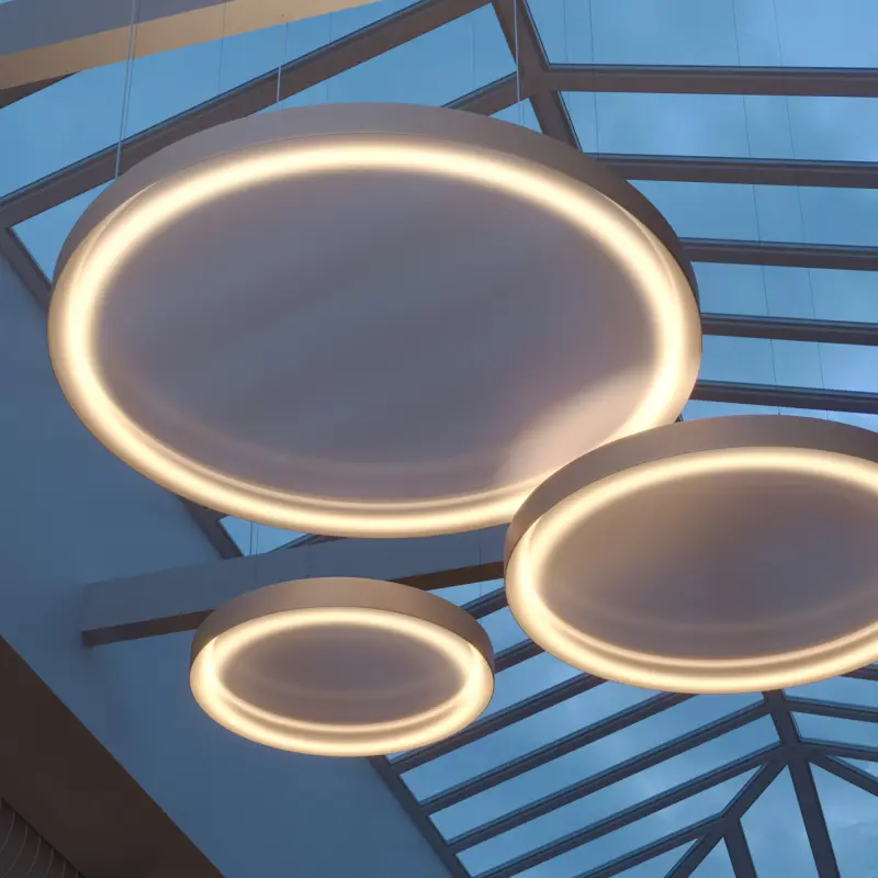AGI RINGO ZENITH - серия светодиодных светильников круглой формы с периметральной засветкой и прозрачным верхним полотном. Высота корпуса составляет 70 мм. Доступные диаметры: 650/900/1200 мм.