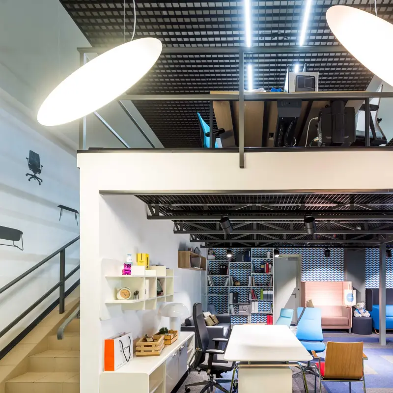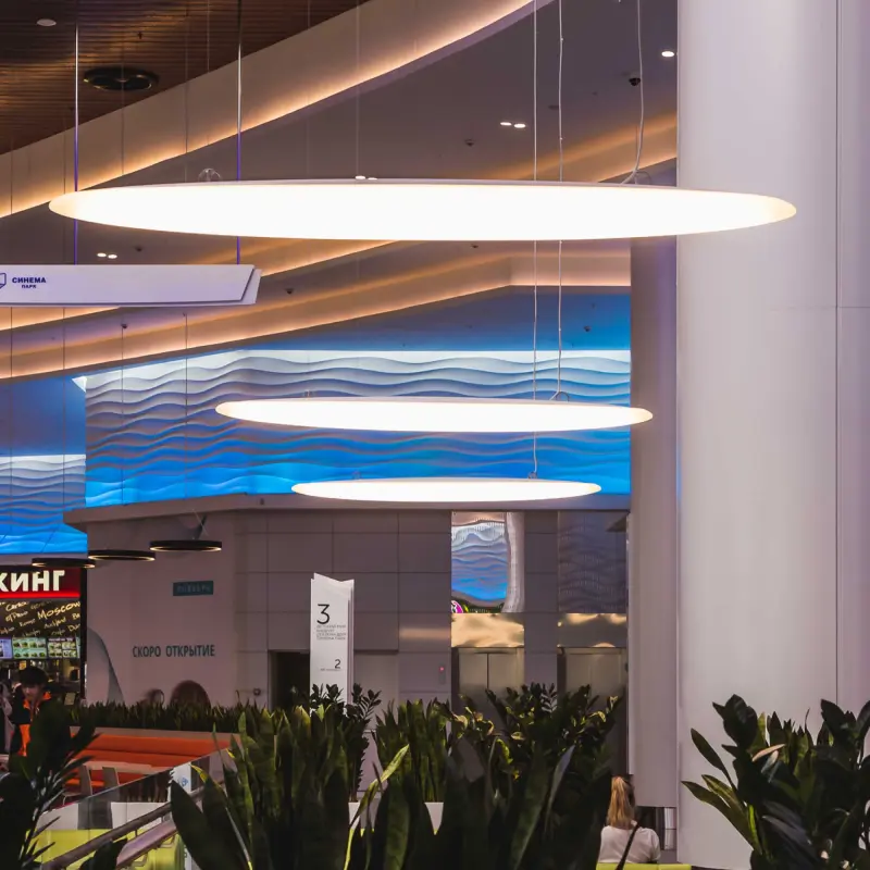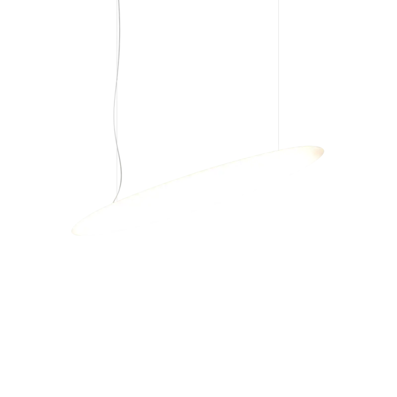 Серия светодиодных дизайнерских светильников BUSA торговой марки БОСМА больших размеров для декоративного и функционального освещения атриумов и холлов отелей, торгово-развлекательных и бизнес-центров, театров и т.д. . Белый корпус-рассеиватель обтекаемой формы этого большого подвесного светильника имеет коэффициент светопропускания