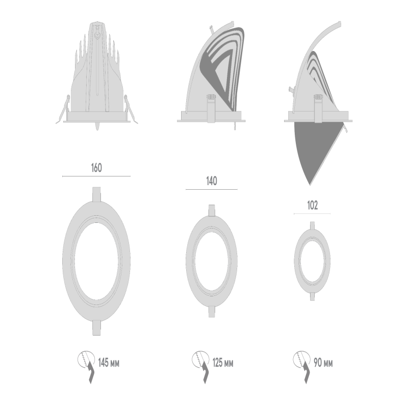 - 18W – DxH 102x80мм, врезное отверстие 90мм, вес 0,38 кг