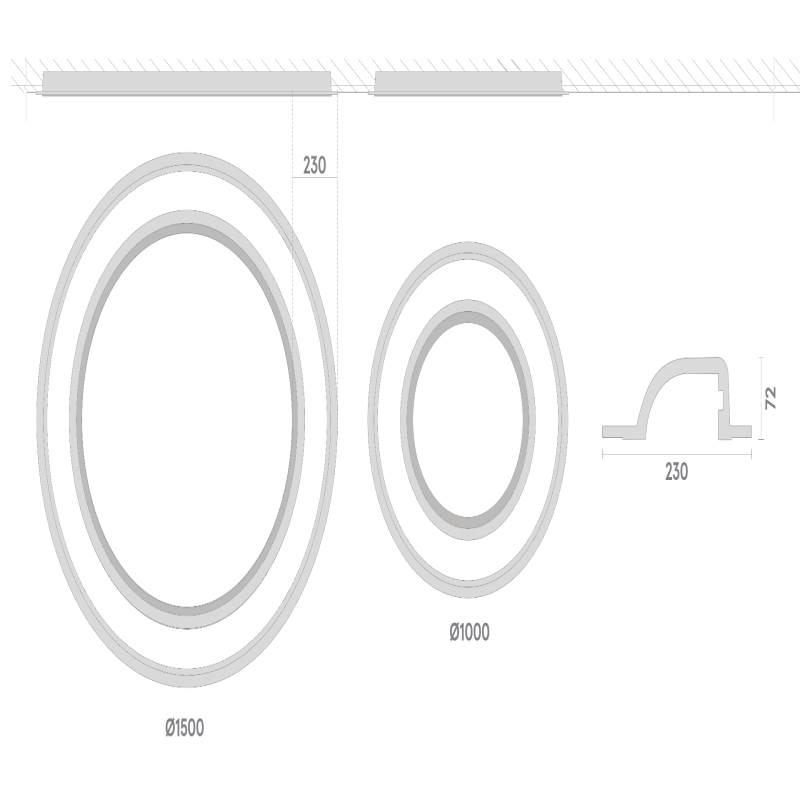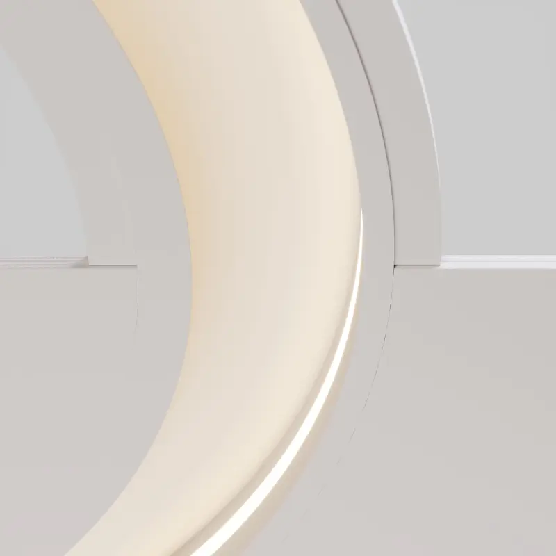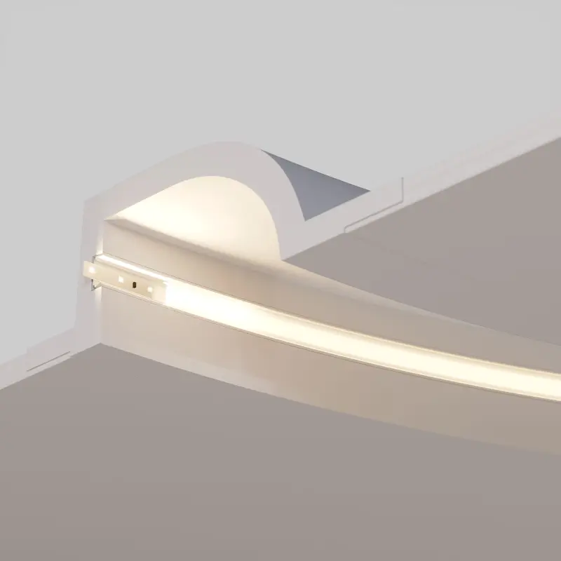 Гипсовые светильники серии FLOCUR встраиваются в поверхность потолка и стен из гипсокартона. Профили FLOCUR представляют собой сегменты окружности и используются для создания кольцевых светильников.