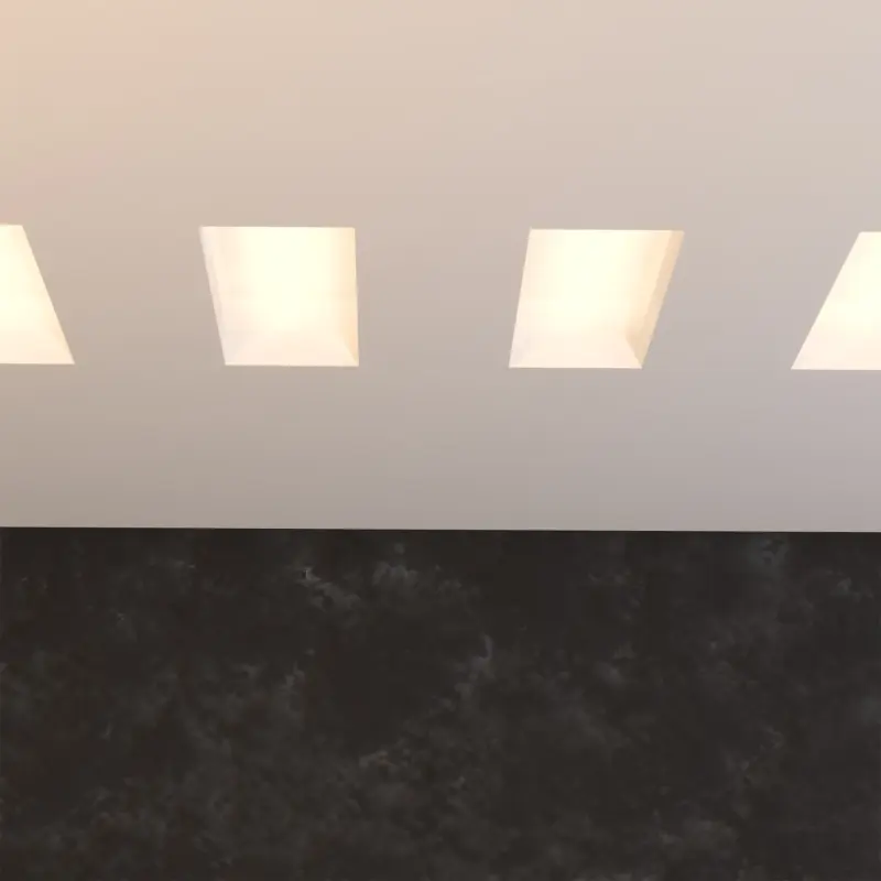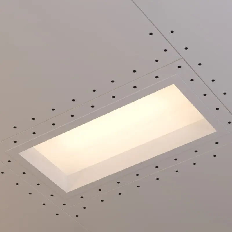 Корпус конструкции гипсовых светильников INBOX монтируется на каркас гипсокартонного потолка. Светотехнический модуль устанавливается в конструкцию после завершения штукатурно-малярных работ, что исключает повреждение источника света в процессе отделки.