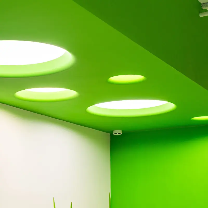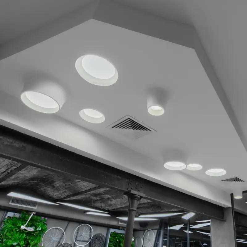 Корпус конструкции гипсовых светильников KRATO монтируется на каркас гипсокартонного потолка или стен. Светотехнический модуль устанавливается в конструкцию после завершения штукатурно-малярных работ, что исключает повреждение источника света в процессе отделки.