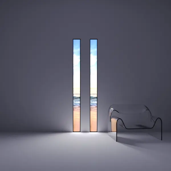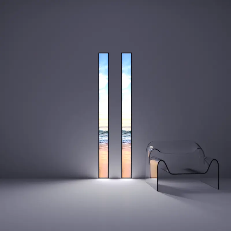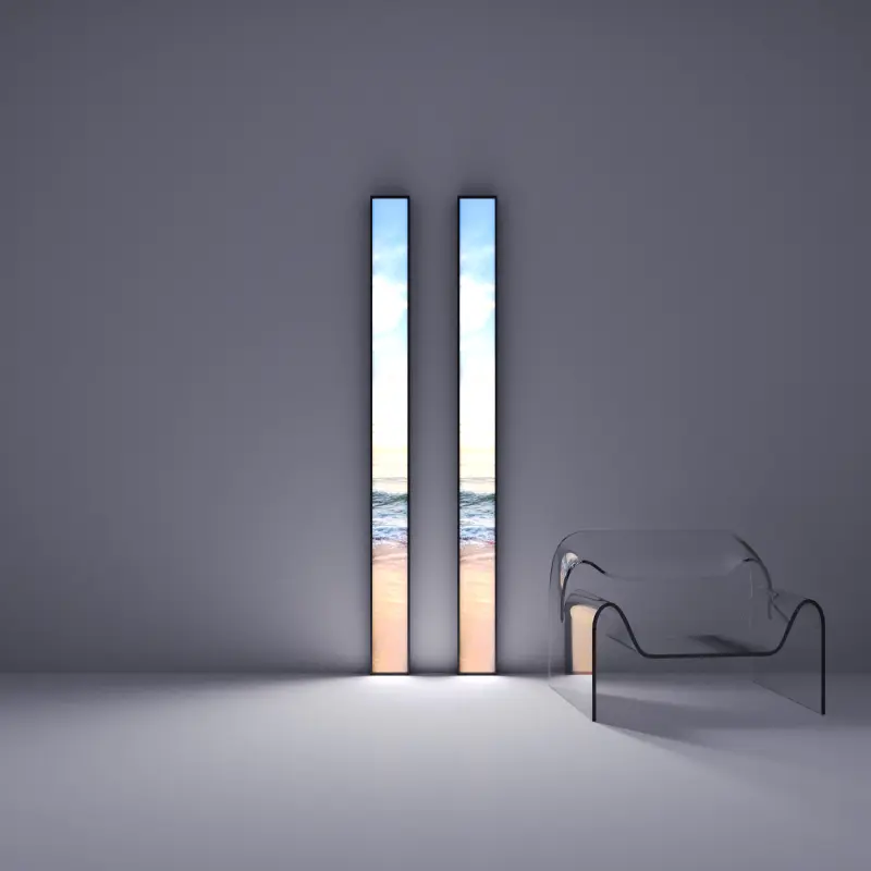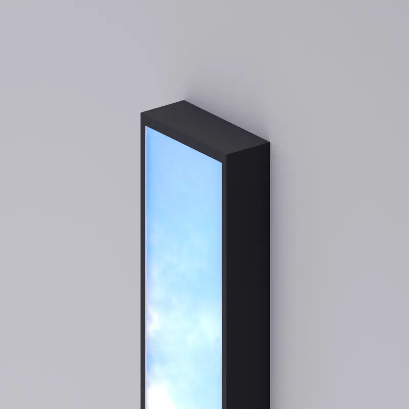 Вечер, за окном уже стемнело, но в помещении царит уют. Стену освещает теплый свет, падающий от необычного светильника. Он имитирует окно, пропускающее мягкий солнечный свет, создавая ощущение простора и воздушности.