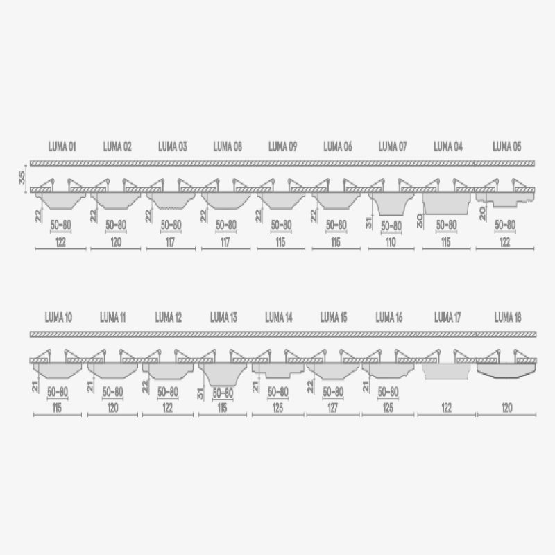LUMA – серия встраиваемых потолочных светильников, изготовленных из гипсополимера, включающая в себя восемнадцать моделей: