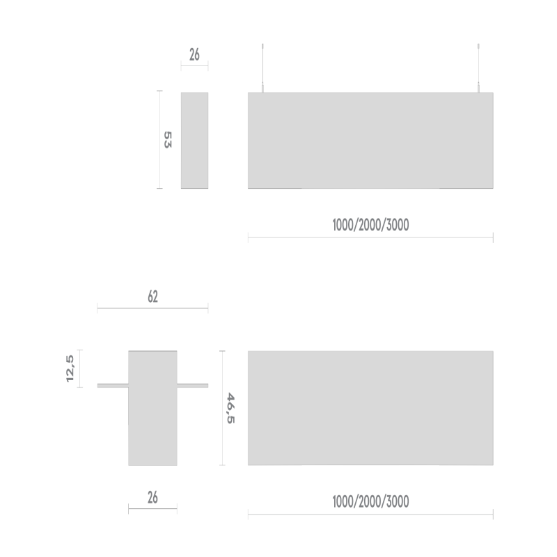 - Накладной/подвесной – LxWxH: 1000, 2000,3000x26x53 мм