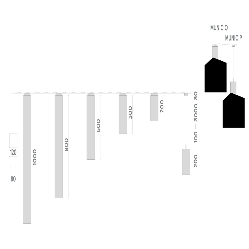 Светильник MUNIC имеет форму трубы с квадратным сечением 120 мм, что позволяет использовать его в любом интерьере. Доступны несколько вариантов длин светильника. Заказчик может самостоятельно подобрать источник света с различной мощностью, углом распределения светового потока, цветовой температурой. Источник света в комплект не входит.