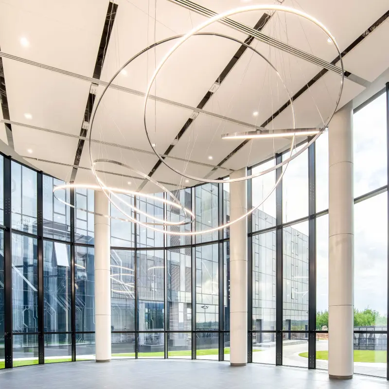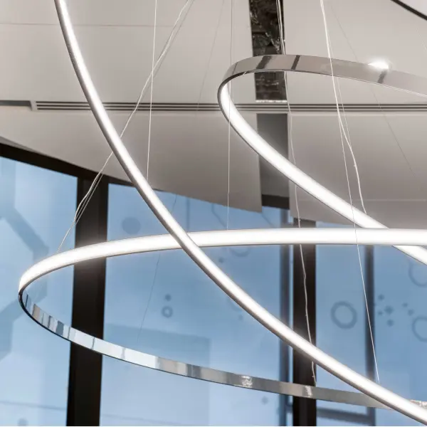 Серия подвесных светодиодных светильников кольцеобразной формы ORIO II (торговая марка БОСМА). Светильник представляет собой плоское кольцо толщиной 15 мм и высотой 50 мм. Источник света может быть расположен на внутренней или на внешней поверхности кольца. Драйвер расположен в декоративном драйвер боксе, с помощью которого осуществляется крепление к плоскости потолка. Светильник поставляется с комплектом регулируемых подвесов. В размерном ряду представлено 6 диаметров светильника, что позволит найти решение для освещения помещений с любой высотой потолка.