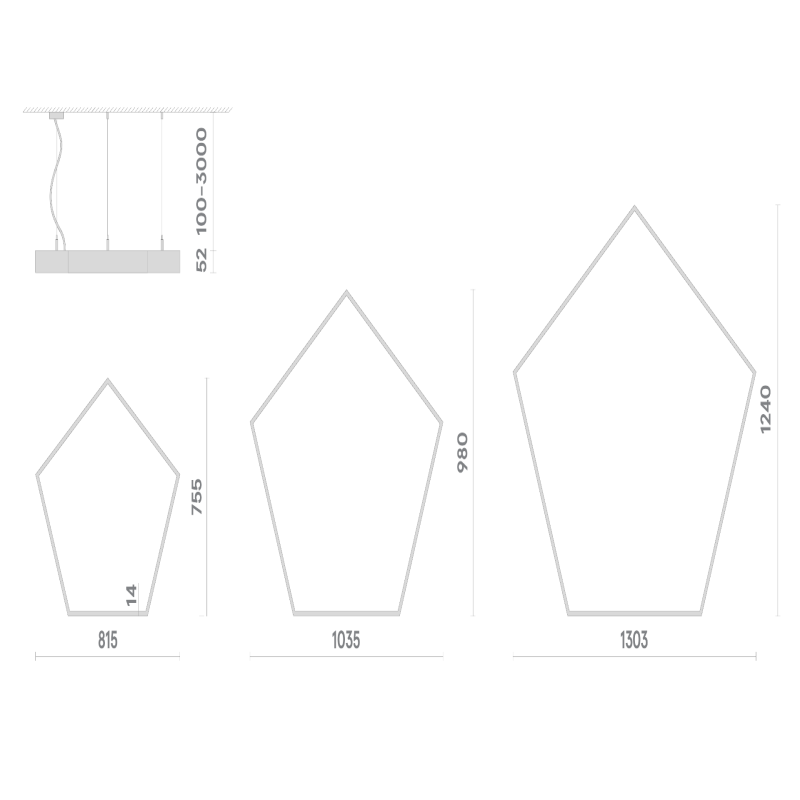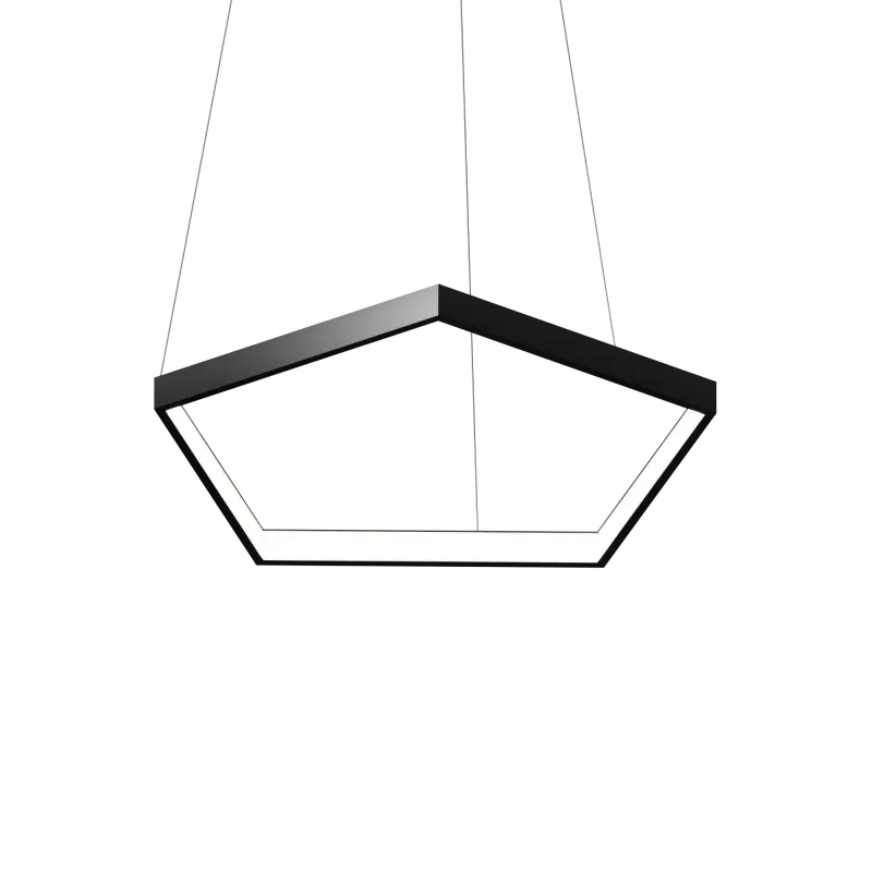 Серия подвесных светодиодных светильников ORIO PENDO (торговая марка БОСМА). Светильник представляет собой пятиугольник толщиной 14 мм и высотой 52 мм. Источник света расположен на внутренней поверхности светильника. Драйвер расположен в декоративном драйвер боксе, с помощью которого осуществляется крепление к плоскости потолка. Светильник поставляется с комплектом регулируемых подвесов.