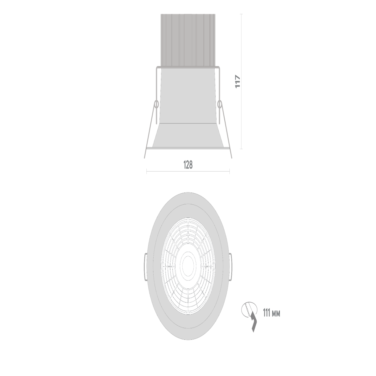 Светильник устанавливается в модульные подвесные или гипсокартонные потолки с высотой запотолочного пространства не менее 115 мм. Простая и быстрая установка при помощи надежных пружинных клипс. Диаметр монтажного отверстия 110 мм.