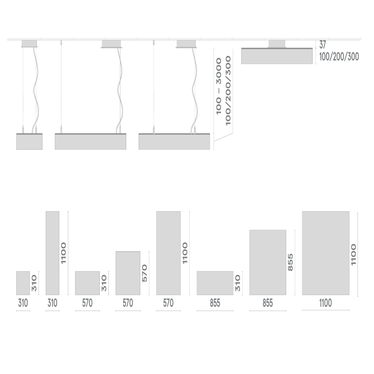 Светильник укомплектован высококачественными светодиодными источниками света (LED), блоком питания, комплектом регулируемых подвесов 3000 мм, кабелем подключения, шаблоном разметки отверстий для установки креплений.