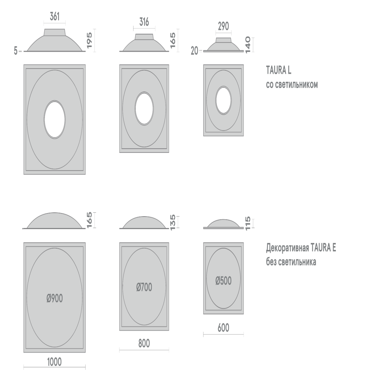 Корпус светильников TAURA диаметрами 500 мм выполнен из гипса, светильник диаметром 700 мм и 900 мм выполнен из стекловолокна. Драйвер (блок питания) интегрирован в корпус светильника.