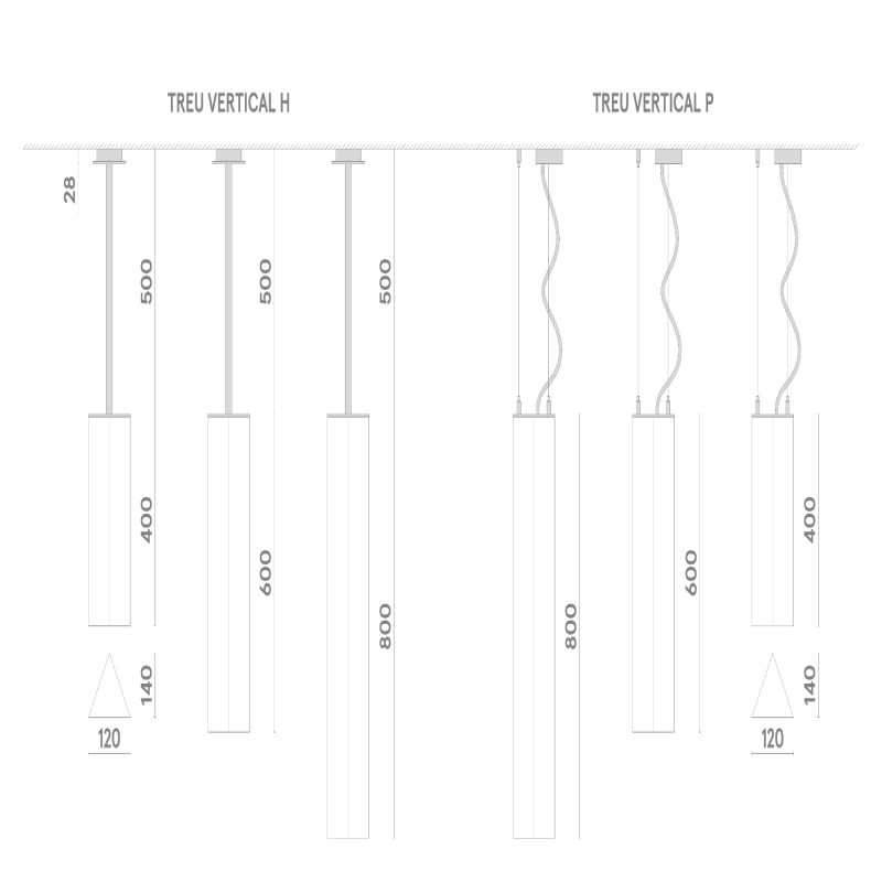 Светильники серии TREU VERTICAL выпускаются с двумя типами подвесов: регулируемым цанговым подвесом (версия P) и жестким алюминиевым подвесом, являющимся конструкционной частью корпуса (версия H).