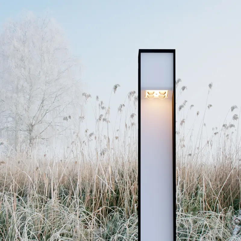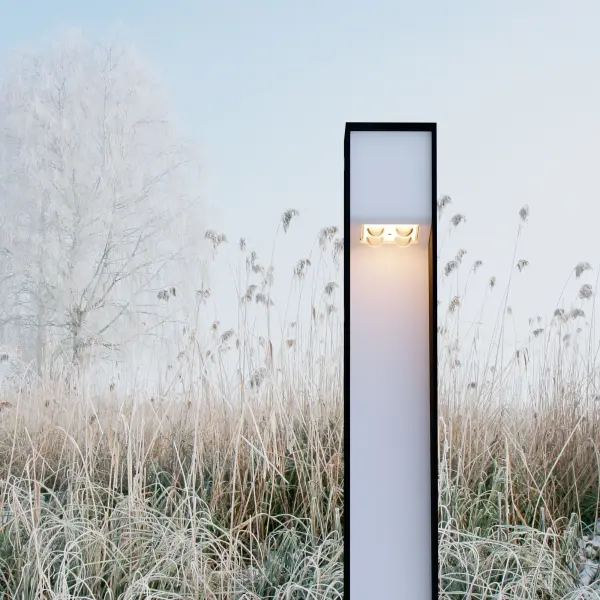 Одновременно минималистичный и декоративный светильник в матовом чёрном корпусе, который обрамляет яркую глянцевую цветную вставку-экран. Предлагаемые высоты светильника 600 и 1000мм делают его прекрасно подходящим для садово-паркового освещения, общественных пространств и частных участков.