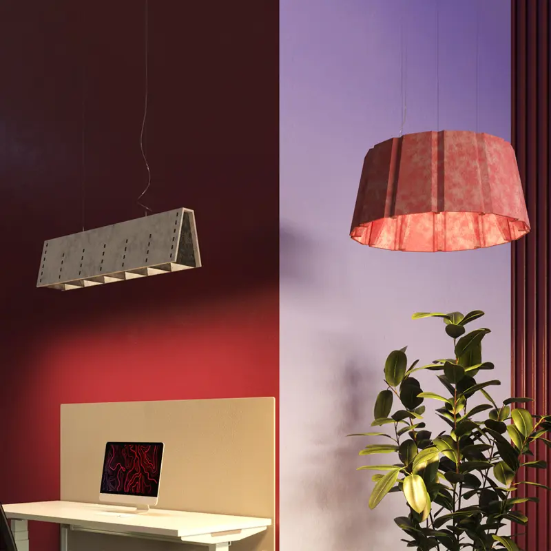 Особенность: материал внешнего корпуса и панелей светильника. «Обложка» VERNA II ACOUSTIC изготовлена с использованием войлока PET FELT, панели светильника – из переработанных PET пластиковых отходов. Это делает модель не только экологичной и гипоаллергенной, но и гарантирует долгую эксплуатацию. Другой плюс материала – легкая очистка при необходимости.