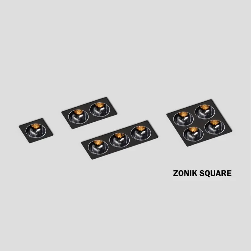 ZONIK SQUARE – серия встраиваемых светильников серии ZONIK в новой, квадратной форме. Возможность наклона корпуса под углом 15° позволяет использовать светильник для расставления световых акцентов – например, для выделения какого-либо настенного объекта. Светильник характеризуется небольшими габаритами. Применяется для общего функционального освещения торговых и административных зданий.