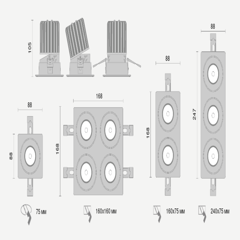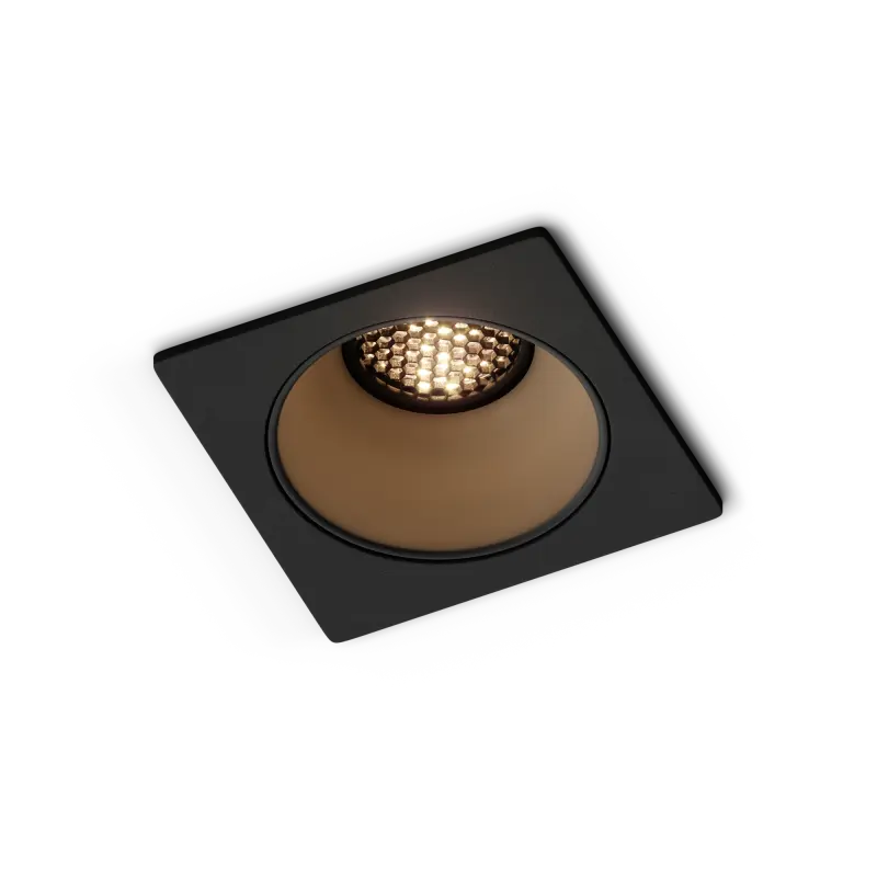 Материал корпуса – алюминий. Изготовлен методом литья. Сотовый блокиратор в светильники снижает общий показатель дискомфорта (UGR).На выбор представлены четыре типа корпусов: квадрат (одиночный), два и три светильника прямоугольной формы, квадрат из четырех моделей. Доступны четыре цвета внутреннего кольца на выбор: матовый черный, матовый белый, глянцевое золото, глянцевый хром.