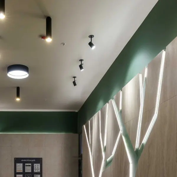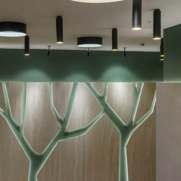 Основные зоны офиса, включая коридоры и рабочие места, оснащены светильниками RETA II, интегрированными в реечный потолок. Они создают ровный и комфортный свет, а система управления DALI позволяет гибко настраивать сценарии освещения под конкретные задачи. Стены коридоров дополнены акцентными светильниками TEMULA CUP на жестком штоке — они выделяют тематическую графику и надписи, поддерживая фирменный стиль интерьера.